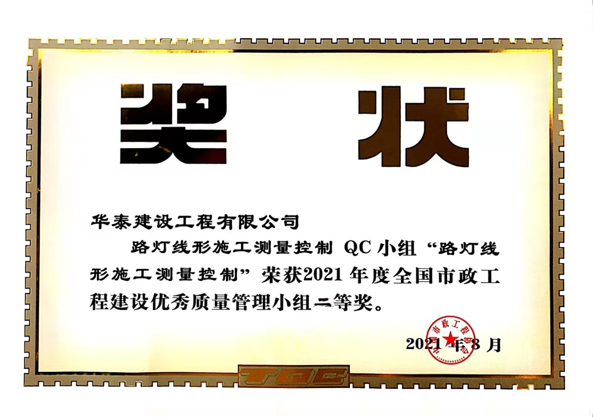 弋陽北入口道路暢通工程項目設計采購施工(EPC)總承包工程路燈線性施工測量控制QC小組“路燈線形施工測量控制”榮獲2021年度全國市政工程建設優秀質量管理小組二等獎。