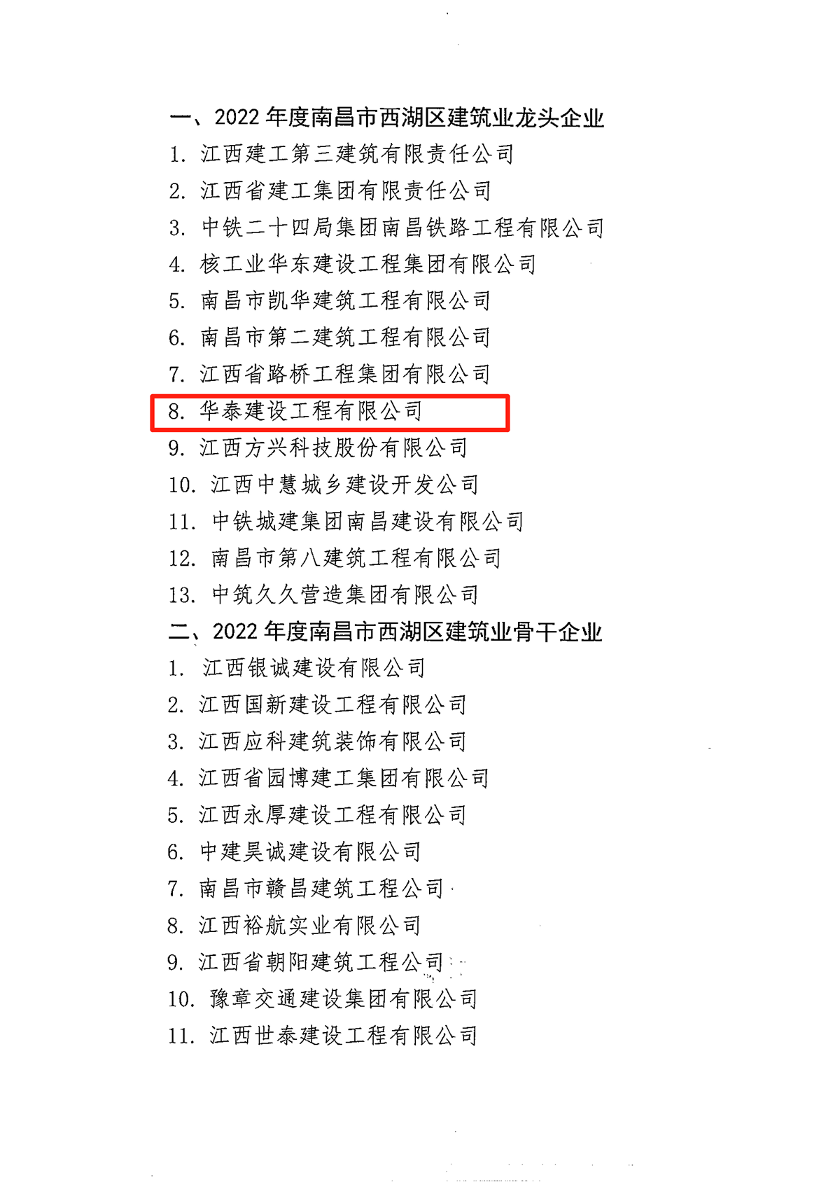 2023年2月21日,恰逢農歷二月二龍抬頭,在這個紅紅火火的日子,南昌市西湖區住房和城鄉建設局發布了《關于公布2022年度南昌市西湖區建筑業龍頭企業、骨干企業名單的通報》,經層層嚴格考評認定,華泰建設工程有限公司憑借實干篤行與卓越品質獲得“2022年度南昌市西湖區建筑業龍頭企業”榮譽稱號!這是繼2023年1月獲得“2022年度南昌市建筑業骨干企業”后的又一個榮譽認證。這不僅是對華泰建設的嘉獎與再次肯定,更是對華泰建設發展的激勵與鞭策。
