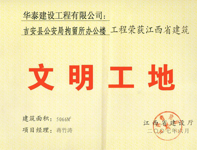 首頁 > 關于華泰 > 企業榮譽 > 吉安縣公安局拘留所辦公樓榮獲省文明工地獎