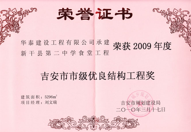 首頁 > 關(guān)于華泰 > 企業(yè)榮譽(yù) > 新干縣第二中學(xué)食堂工程榮獲2009年市級(jí)優(yōu)良結(jié)構(gòu)工程獎(jiǎng)